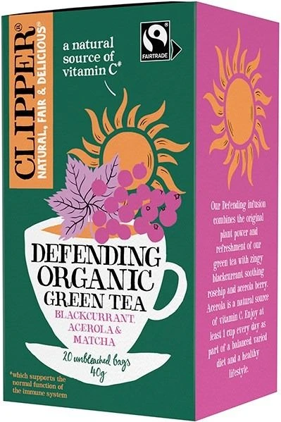 Clipper Organic Defending infusion combines the original plant power and refreshment of green tea with zingy blackcurrant, soothing rosehip and acerola berry. Acerola is a natural source of vitamin C. Enjoy at least 1 cup every day as part of a balanced, varied diet and a healthy lifestyle.