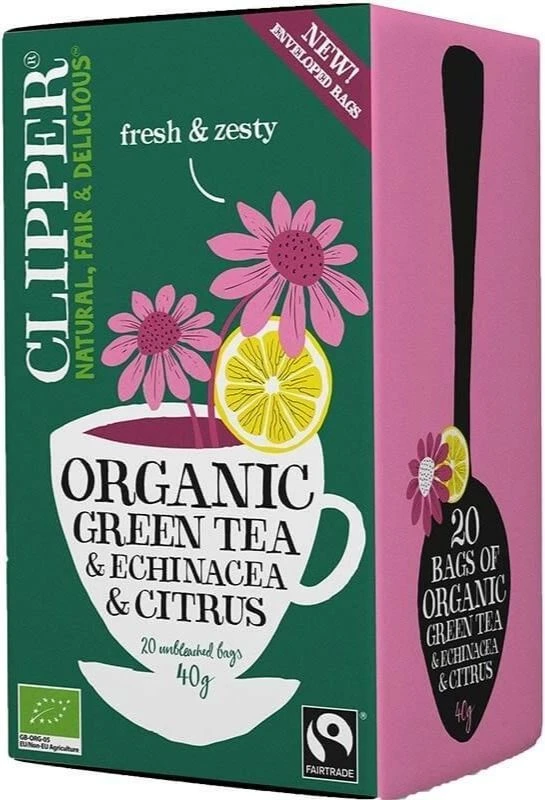Clipper Organic Green Tea & Echinacea & Citrus – A light and refreshing green tea blended with Echinacea and zesty flavours of lemon, orange and lime. The green tea comes from Fairtrade tea plantations in India and China. Blended and packaged at the Clipper tea factory in southern England.