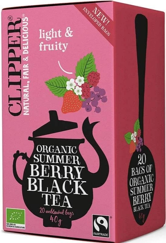 Enjoy summer all year round! Clipper Organic Summer Berry Black Tea is a delicious blend of black tea, blackcurrant, strawberry and raspberry. This light and berry Fairtrade organic tea is blended and packaged at Clipper’s tea factory in southern England.