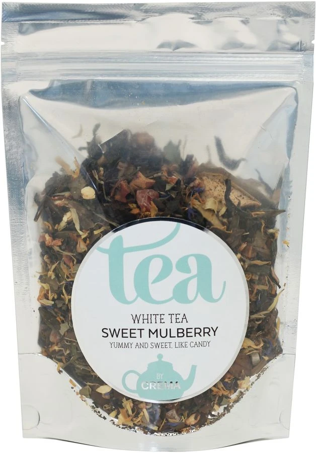 Crema White Tea Sweet Mulberry has a radiant delicate flavor complemented by delicious and slightly toffee-like mulberries – like candy! Gorgeous, captivating fragrance and sweet taste of white tea, which also gets its flavor from papaya and apples. Simmer the tea in 70-degree water 2-4 minutes.