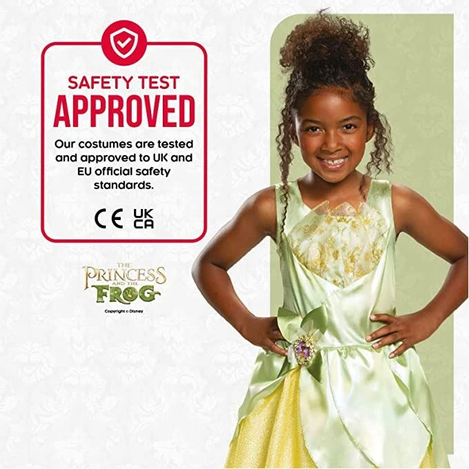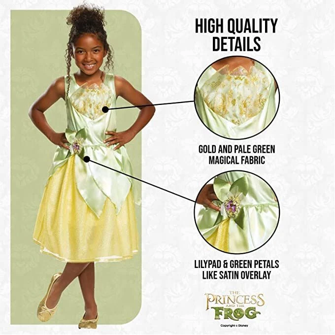 The kids’ Princess Tiana deluxe costume lets your little girl become the much-loved character from Disney’s hit movie, the Princess and the Frog (no frog kissing required). Officially licensed by Disney, this beautiful costume dress is based on Tiana’s look from the movie and will bring joy and delight to your little one in time for their next costume party or dress-up event.