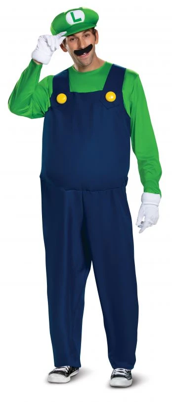 The deluxe outfit includes Luigi’s iconic green and blue jumpsuit with padded belly, his hat, gloves and of course his trademark moustache.