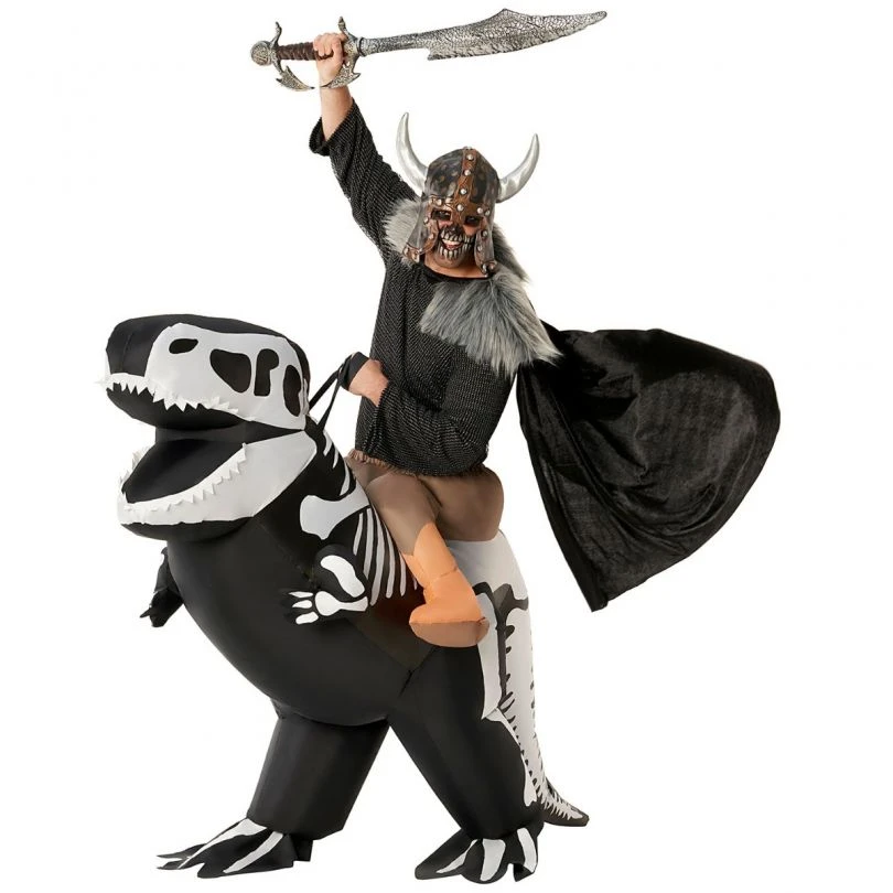 An undead warrior wouldn’t ride something as simple as a horse now, would they? With the adults Ride On T-Rex skeleton inflatable costume, you can bring some real terror (and a few laughs) to your next Halloween party. Thanks to a clever optical illusion, this inflatable fancy dress costume will make you look as though you’re riding atop an undead skeleton T-Rex all night long.